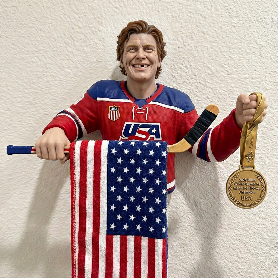 🎁A tribute to Olympic greatness.Dressed in the iconic Team USA jersey and holding a gold medal marked “2026 Winter Olympics – Men’s Ice Hockey Champion,” this sculpted wall mount captures the emotion, pride, and achievement of a historic win. The integrated hockey stick bar securely holds your towel in true championship style.