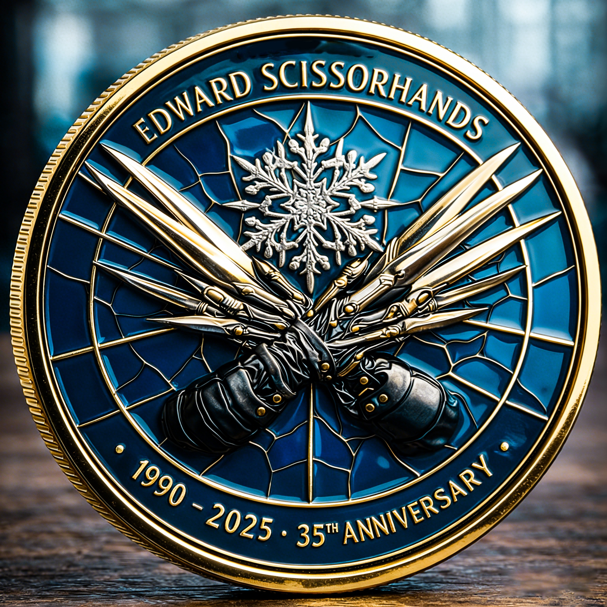 Crafted with premium metal and a rich gold finish, this coin is filled with stunning detail — from Edward’s scissor hands ✂️ to the stained-glass style background. It has real weight, real presence, and real emotional impact.